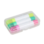 Set de 3 destacadores de cera dentro de estuche traslúcido de PVC.