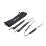 Set para barbacoa de madera y acero inoxidable. Incluye tenedor, pinza y espátula. Cuenta con bolsa con cierre ajustable.