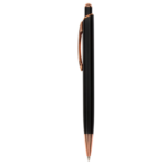 BOLÍGRAFO Metal. Cuerpo de aluminio, acabado engomado color negro, muy suave al tacto. Bolígrafo retráctil. Clip, puntera y detalles metálicos color cobre. Tinta Azul. Decapa color cobre. TINTA AZUL u TINTA NEGRA