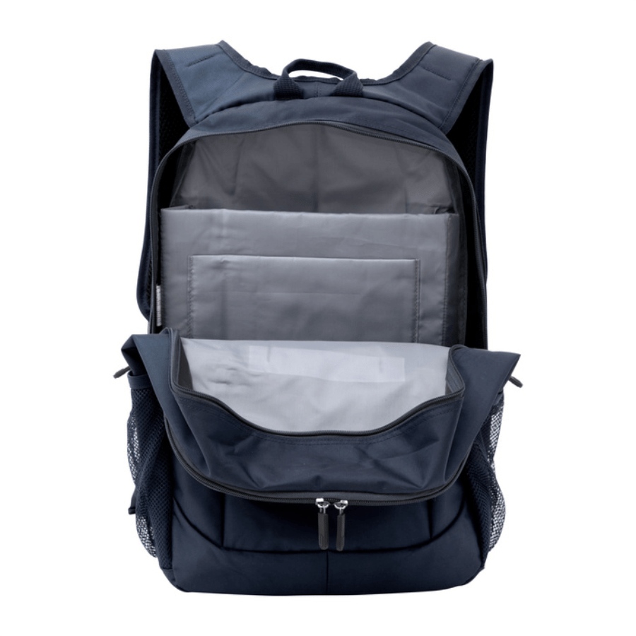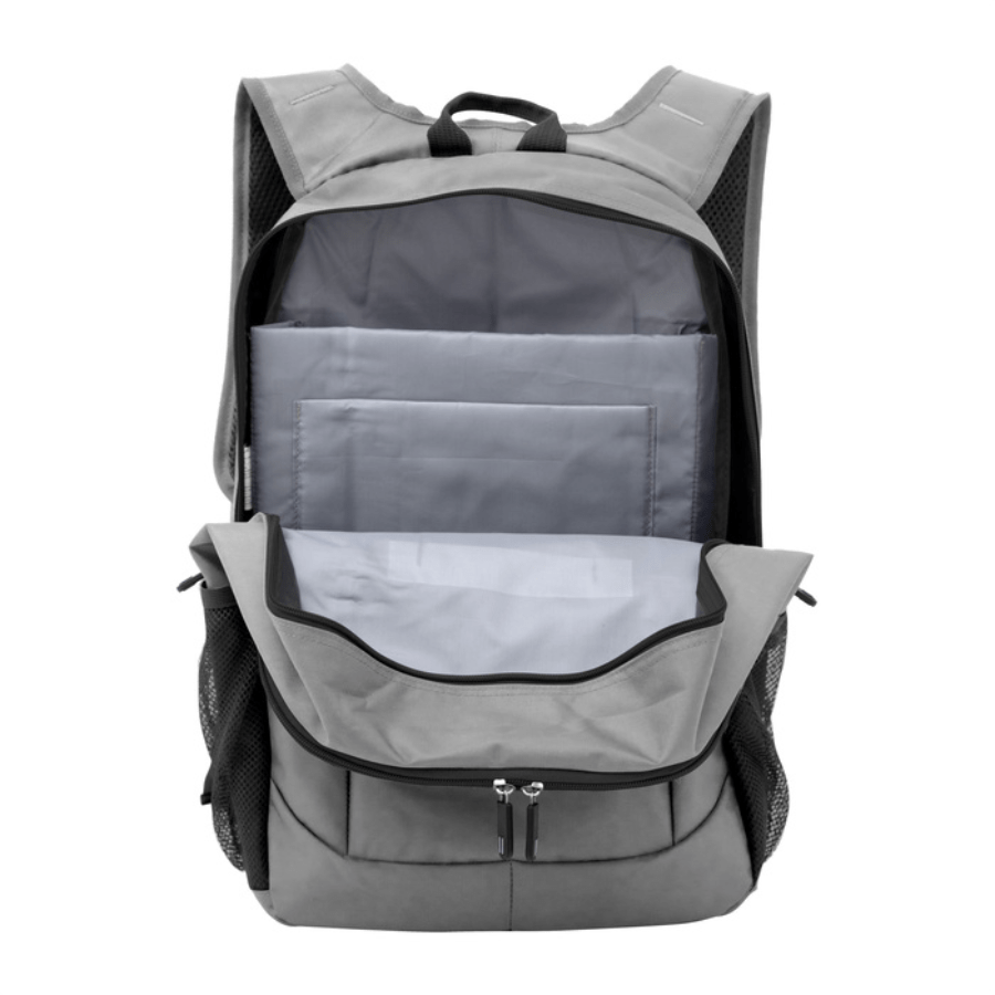 Mochila portanotebook de hasta 16 pulgadas. 2 compartimentos con doble cierre. Amplio compartimento principal posterior con bolsillos acolchados portanotebook y portatablet. Compartimento frontal, interior con bolsillos organizadores y 1 bolsillo frontal con cierre horizontal. 2 Bolsillos laterales de red elastizados porta botellas y accesorios. Asa superior, correas ajustables reforzadas y acolchadas, unidas en su parte superior para mayor resistencia, protección y comodidad. Espalda acolchada. Cierres metálicos con deslizadores de goma con detalles de color.