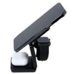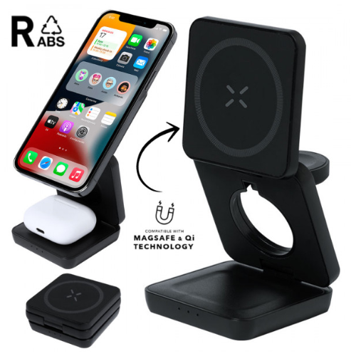 Cargador inalámbrico magnético 4 en 1 de 15W, fabricado en ABS reciclado (RABS). Diseñado para la carga simultánea del smartphone, auriculares, smartwatch y soporte. Un gadget todo en uno: plegable, portátil, de tamaño compacto, muy versátil y de diseño funcional. De acabado mate con tacto gomoso. Conexión por usb Tipo C -cable incluido-.El RABS es un plástico altamente reciclable de gran resistencia y con multitud de aplicaciones que lo convierten en una solución eco-friendly. Fabricado conforme a los estándares RoHS y en cumplimiento con los siguientes requisitos de seguridad:Sistema de protección contra sobrecalentamiento.Sistema de protección contra sobrecarga.Sistema de bloqueo para evitar cortocircuitos. Inalámbrico 15W. Magnético. Plegable