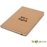 Cuaderno fabricado con cobertura de corcho. Hojas internas de 70 gramos en formato rayado, con 80 hojas en total. El producto se presenta en una bolsa de PLA 100% compostable. Dimensiones: 14 x 21 cm. Reuseme.