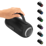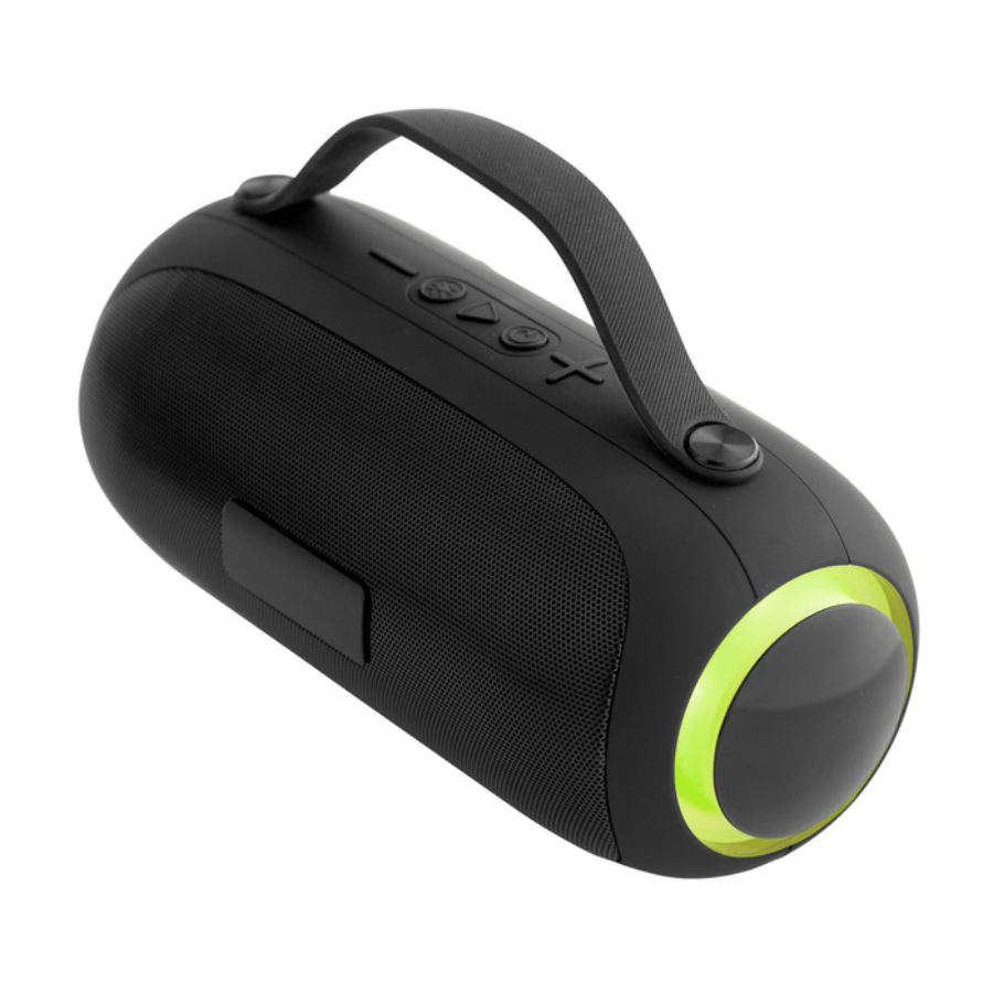 Subwoofer, altavoz de frecuencias graves. Luz led en sus laterales con 7 combinaciones de transición multicolor. Malla metálica con placa independiente. Estructura plástica con textura suave al tacto. Correa de silicona color negro. Ranura para tarjeta SD y conector AUX. Incluye manual de uso. Cable de carga USB-C / DC5V de 80 cm color negro. Base antideslizante.