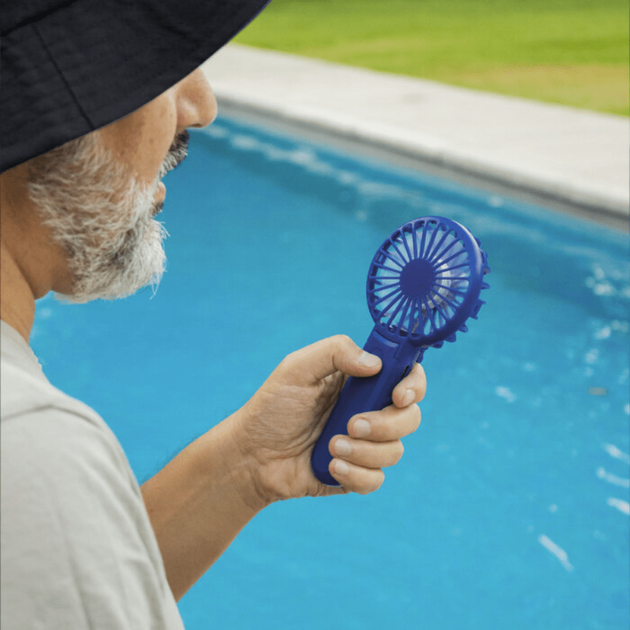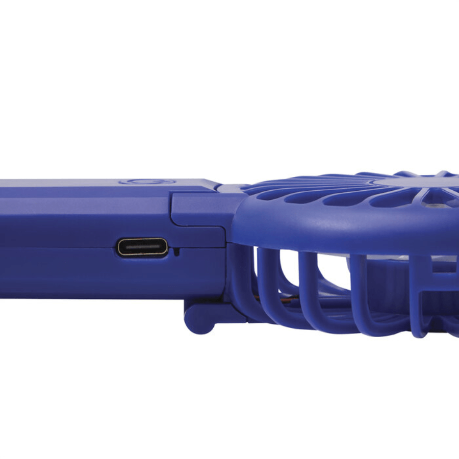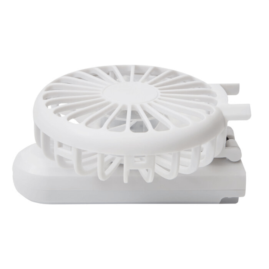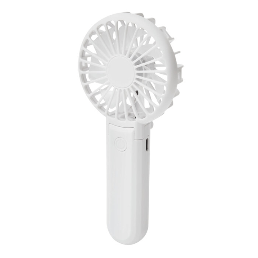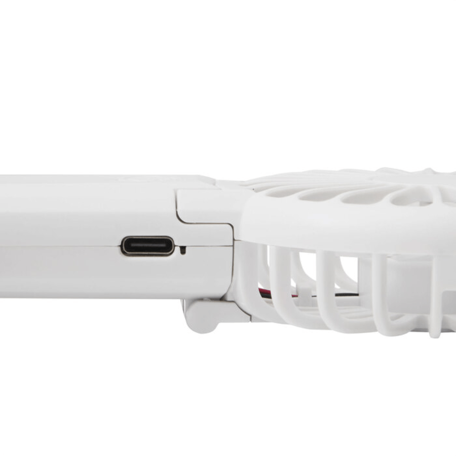 Mini ventilador portátil. Plegable a 180° con doble función, de mano y de escritorio. Diseño compacto, tamaño de bolsillo, ligero y fácil de transportar. 3 velocidades (niveles de flujo de aire: bajo, medio y alto). Silencioso. Batería recargable via USB. Cable de carga USB C color blanco.