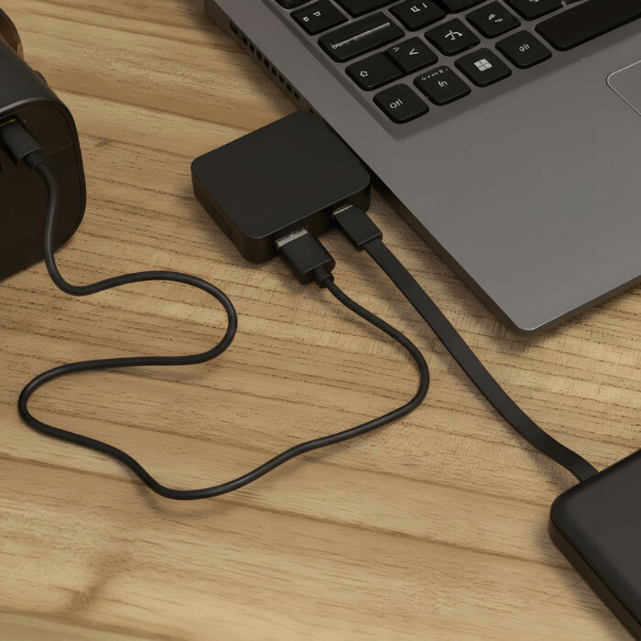 Mini adaptador HUB multipuerto. Entrada: 1 x USB-A / 1 x USB-C. Salida: 2 x USB-A / 2 x USB-C con conectores rebatibles.