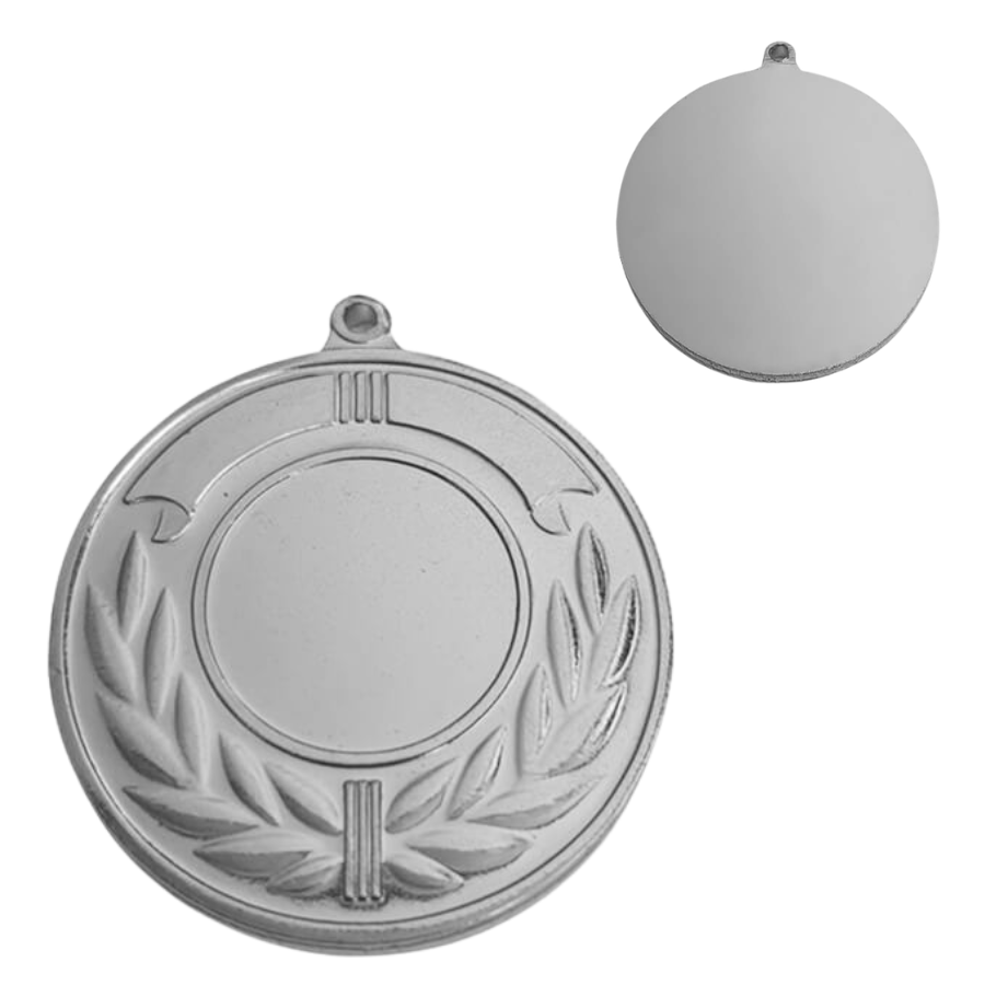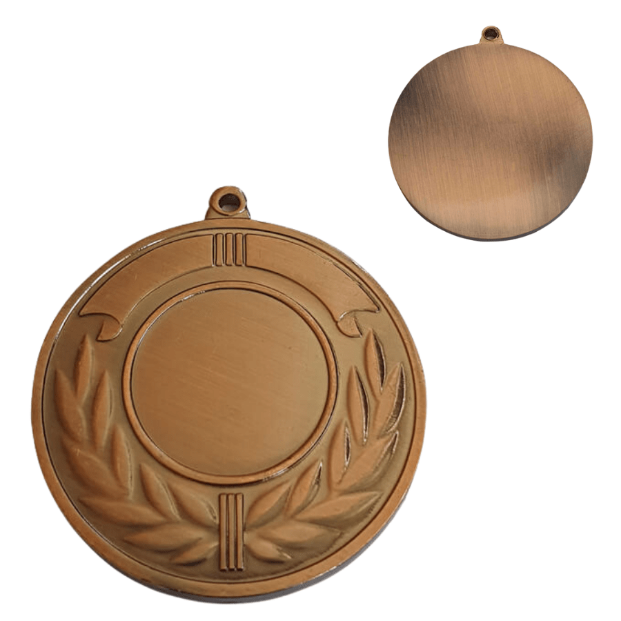 Medalla de 50 mm de diámetro para reconocimiento con diseño hoja de laurel. Colores oro, plata y cobre.