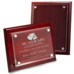 Galvano madera color Caoba y frontis de acrílico. Con orificios para colgar de manera vertical o horizontal en muro. Presentación en caja de cartón blanca.