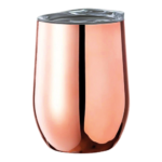 Atractivo mug metálico cobre. Tapón de rosca anti derrame de plástico transparente. Interior acero inoxidable SS 304 y exterior de acero inoxidable SS 201. Base antideslizante.  En caja individual negra. Capacidad 350 ml.