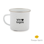 Mug tipo taza construido en carbon steel y esmaltado en color blanco. El producto viene en una bolsa de PLA 100% biodegradable dentro de una caja de cartón. Pampa Spirit.