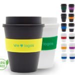 Vaso reutilizable con banda de silicona personalizable. Fabricado en Polipropileno. Producto apto para uso en microondas y lavavajillas. Producto libre de BPA.