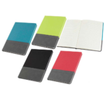 Elegante cuaderno tamaño A5, con cubierta de cartón piedra forrada en Velvet PU (tela aterciopelada) bicolor de 3mm de espesor, con doble costura. Interior 80 hojas lineadas amarillas de 80gsm. Presentación individual en bolsa de polipropileno.