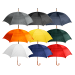 Paraguas ejecutivo con cuerpo y mango curvo de madera barnizada. Varas reforzadas de fibra de vidrio, sistema de apertura automático, 8 cascos tela Nylon 190T.