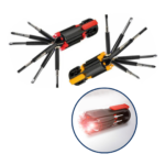 Destornillador linterna 6 en 1. Cuerpo negro y detalles de color rojo, linterna con 4 luces LED, 5 puntas de destornillador y clip sujetador de plástico.