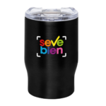 Mug doble pared. Interior de acero 304 y exterior de acero 201. Tapa plástica transparente a presión con anillo de silicona. Mantienen las bebidas frías y calientes por más tiempo. No utilizar con bebidas gaseosas. Presentación en caja de regalo.