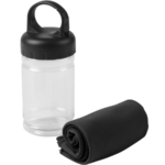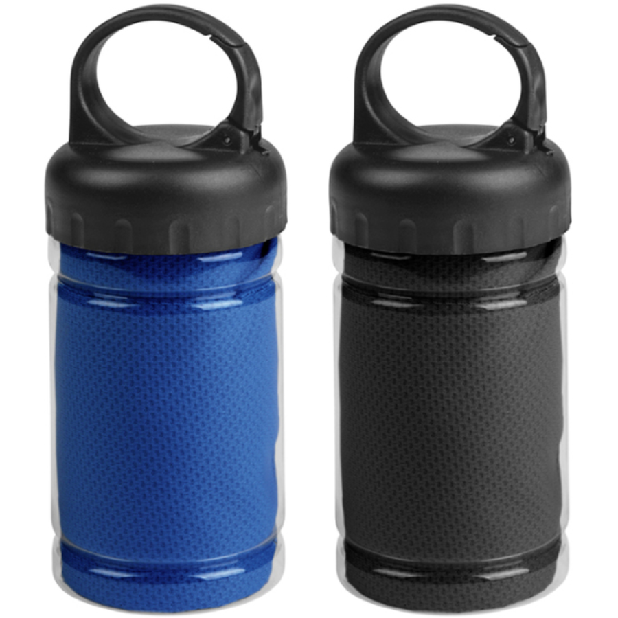 Toalla de enfriamiento en un estuche de plástico transparente. Para un efecto refrescante humedezca la toalla con agua o agregue agua en el cilindro e incorpore la toalla. Tapa a rosca con mosquetón.