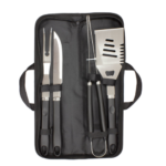 Set de 4 utensilios: tenedor y cuchillo de 41 cm, pinza de 44,5 cm y espátula de 40 cm de largo, todos con mango plástico en color negro. Estuche de nylon 600 D color negro con cierre. Calidad Premium.