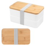 Contenedor de alimentos con tapa de Bambú. Posee dos compartimentos plásticos, un separador y bandeja porta set de 3 cubiertos (cuchillo, tenedor, cuchara). La tapa de bambú debe presionar firmemente la bandeja donde se fija el juego de cubiertos. Cierre con sujeción elástica color gris. Producto apto para microondas (sin la tapa). Importante: solo se puede calentar la comida, NO sirve para cocinarla.
