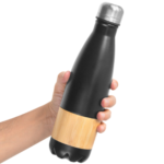 Botella doble pared, sellada al vacío. Interior en acero 304 y exterior en acero 201, con detalles de Bambú. Tapa de acero. Mantiene hasta 12 hs la temperatura de las bebidas calientes y 24 hs de las bebidas frías. Presentación en caja de regalo Kraft.
