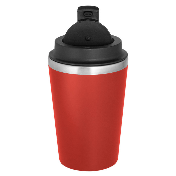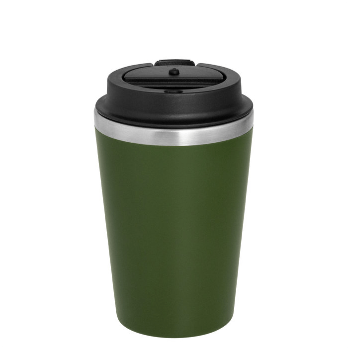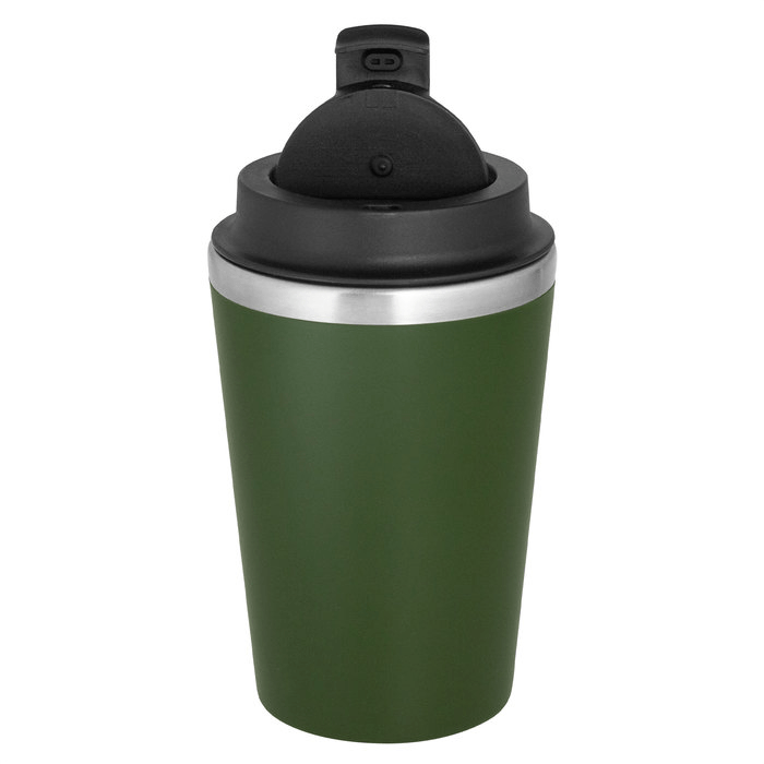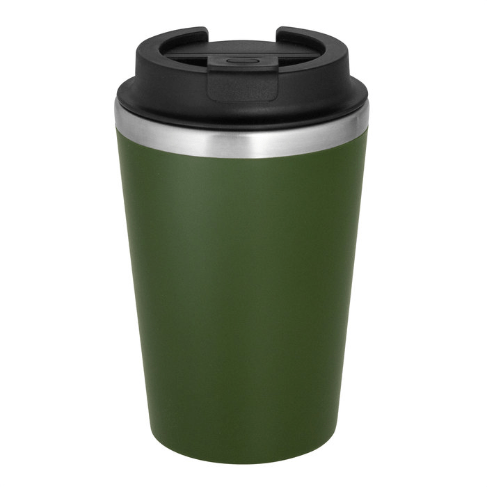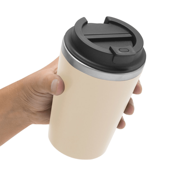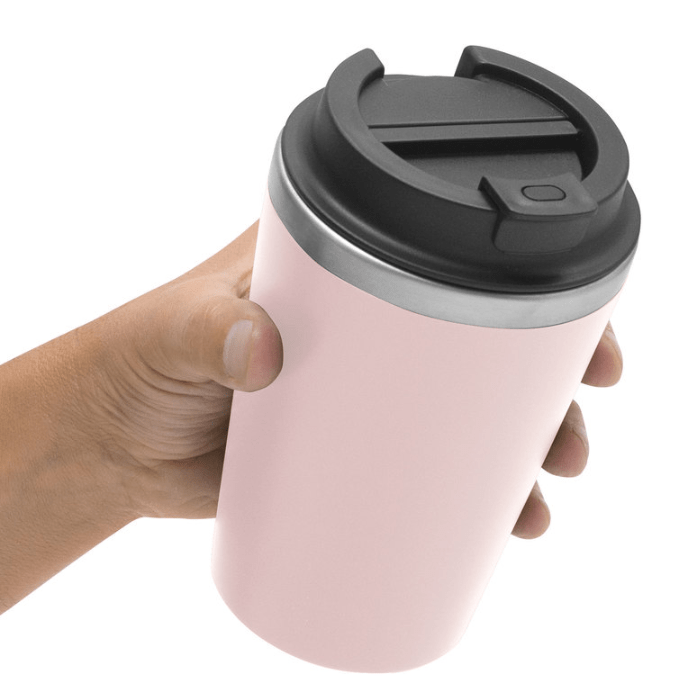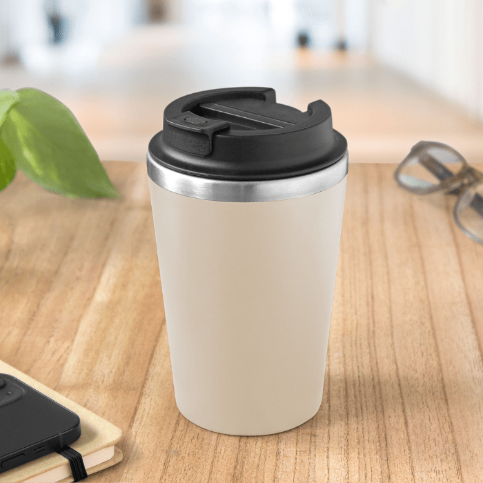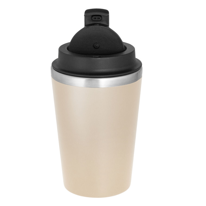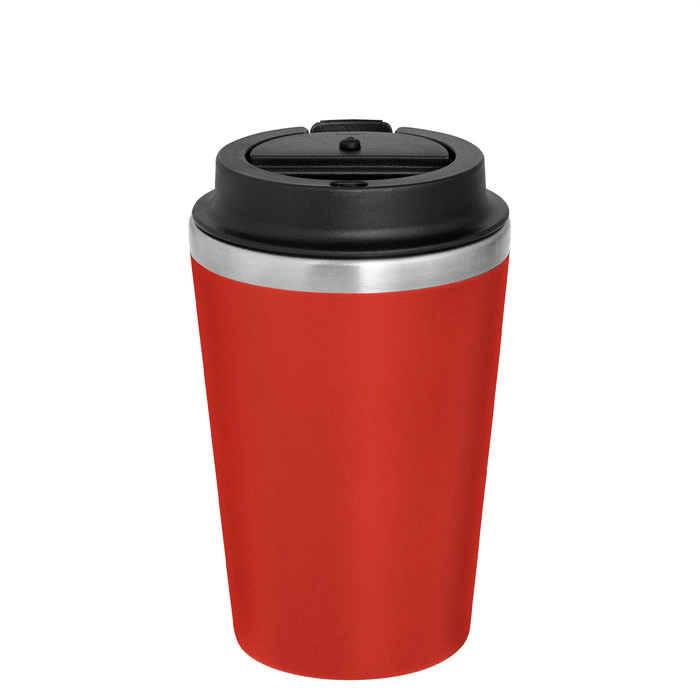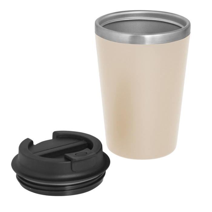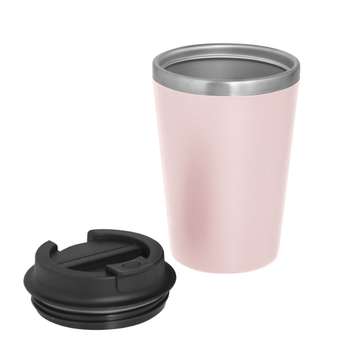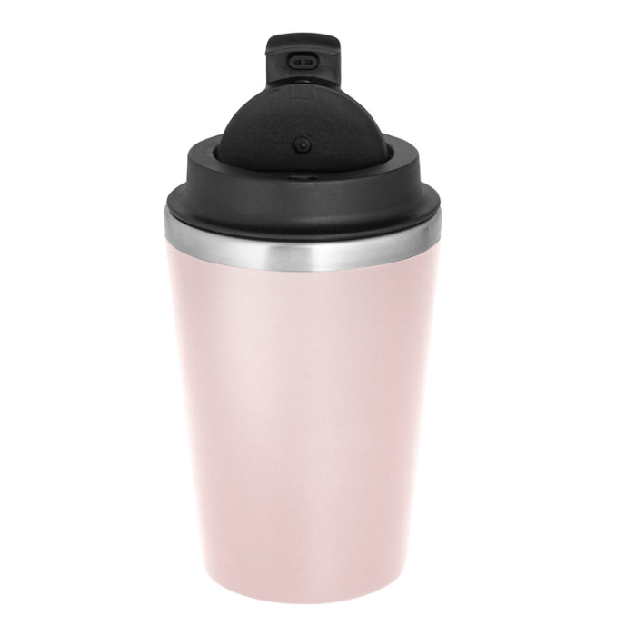 Polipropileno y Acero inoxidable. Mug doble pared. Interior de acero inoxidable 304 y exterior de PP con acabado mate. Tapa de PP con anillo de silicona y seguro antiderrame. Base antideslizante.