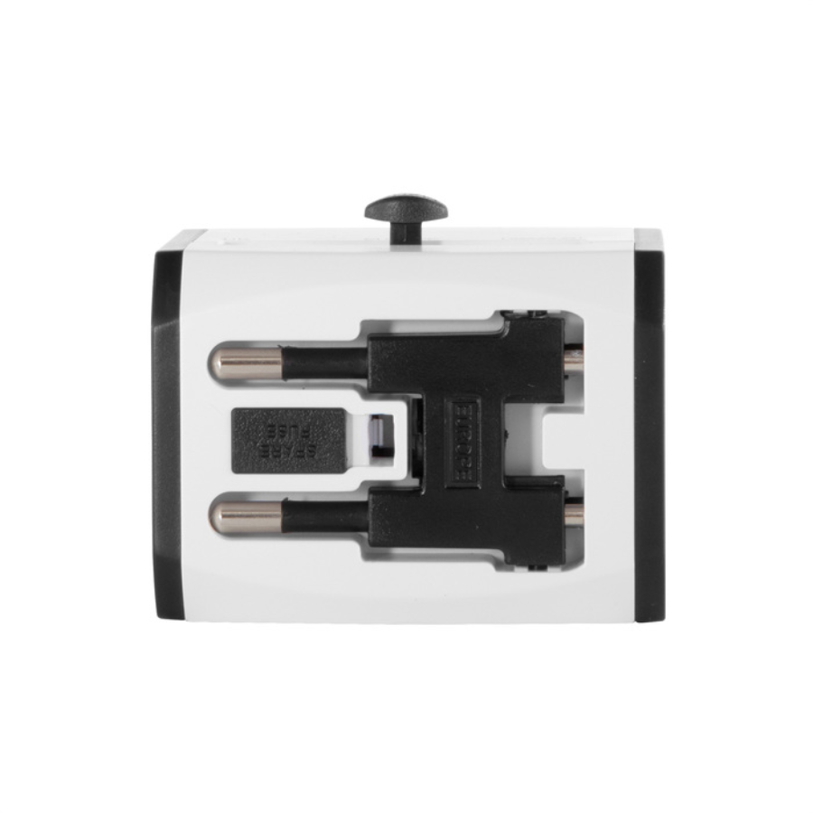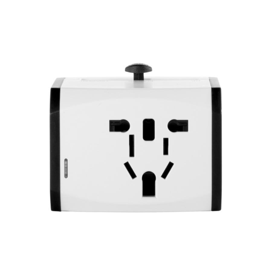 Adaptador universal de viaje. Tres enchufes: dos de la Unión Europea y uno del Reino Unido. Tipo de patas: redondas, cruzadas y paralelas. Toma múltiple. Puertos USB y USB C. Potencia: 100-250V, 6A MAX. Salida total usb: 5V/2.4A máximo por puerto. Presentación: Bolsa non-woven en color gris con cordón y en caja de regalo Kraft.