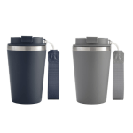Mug doble pared con asa colgante. Interior de acero inoxidable 304 y exterior de Polipropileno con acabado mate. Tapa a rosca de polipropileno con anillo de silicona y seguro antiderrame del mismo color del mug. Asa de poliuretano y poliéster. Presentación en caja de regalo Kraft.