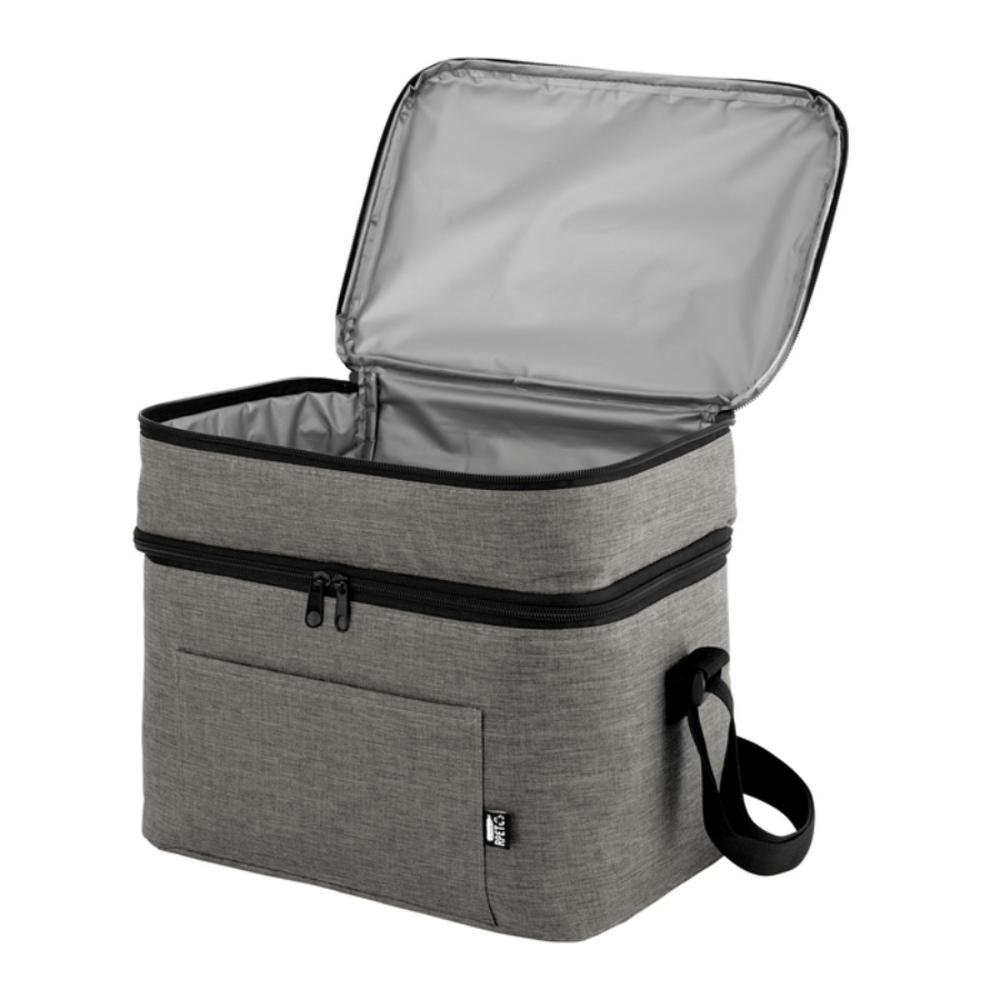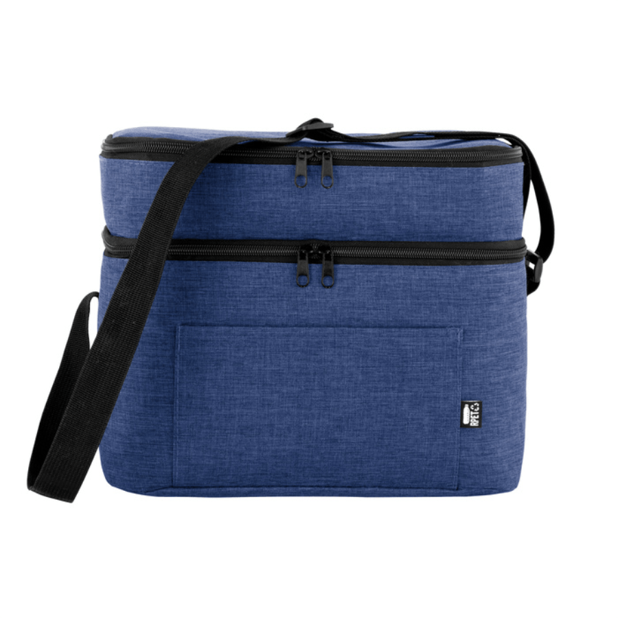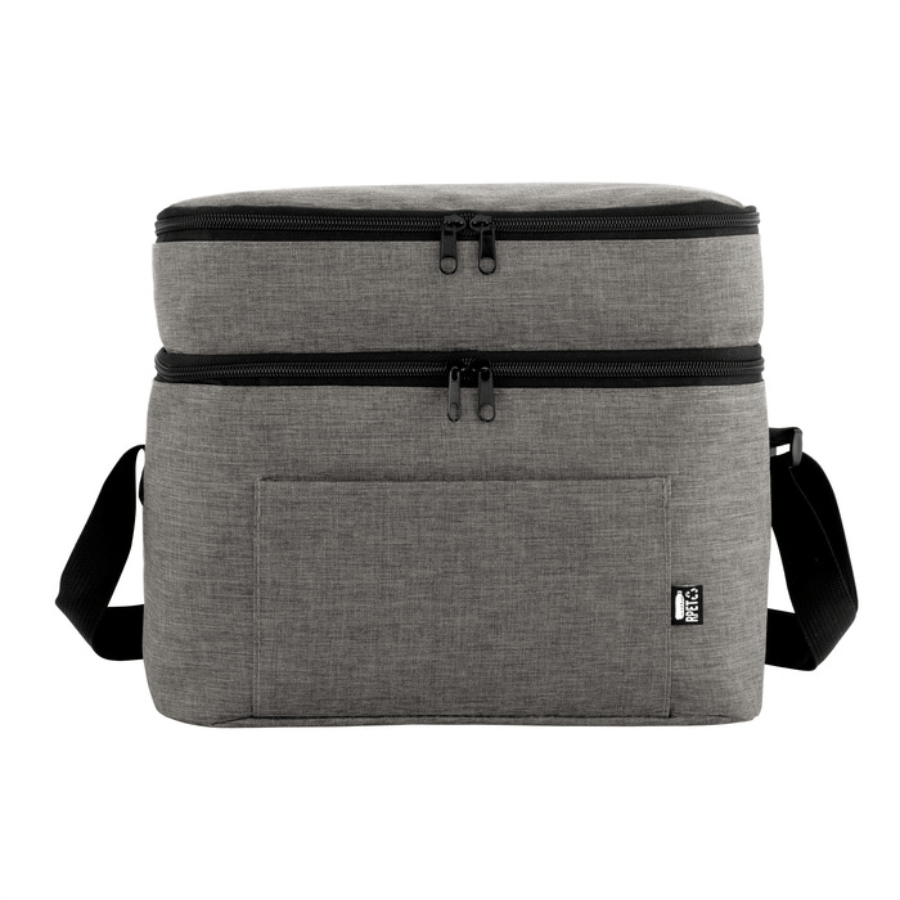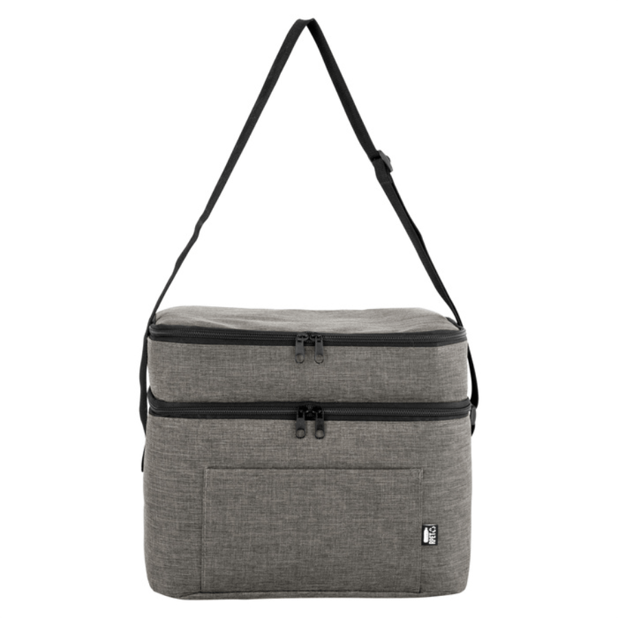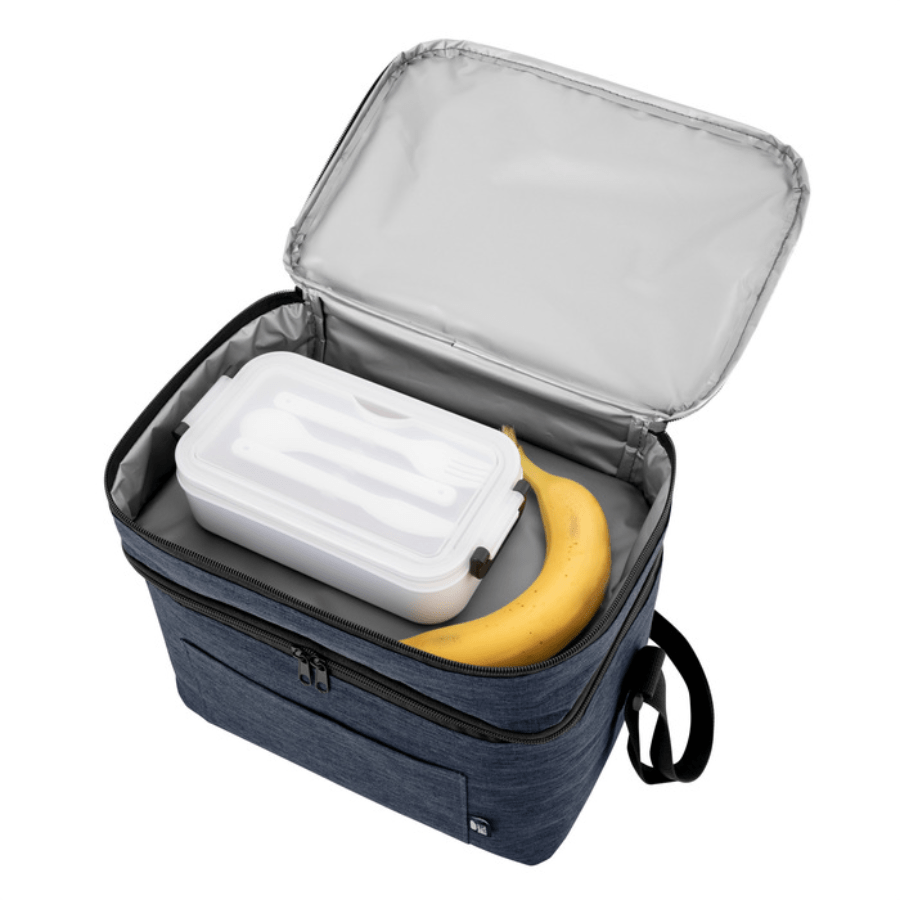 Bolso térmico de dos pisos . Cierres perimetrales bidireccionales. Correa regulable con hebillas plásticas. Bolsillo frontal. Amplio compartimento principal y compartimento superior ideal para separar recipientes con alimentos.