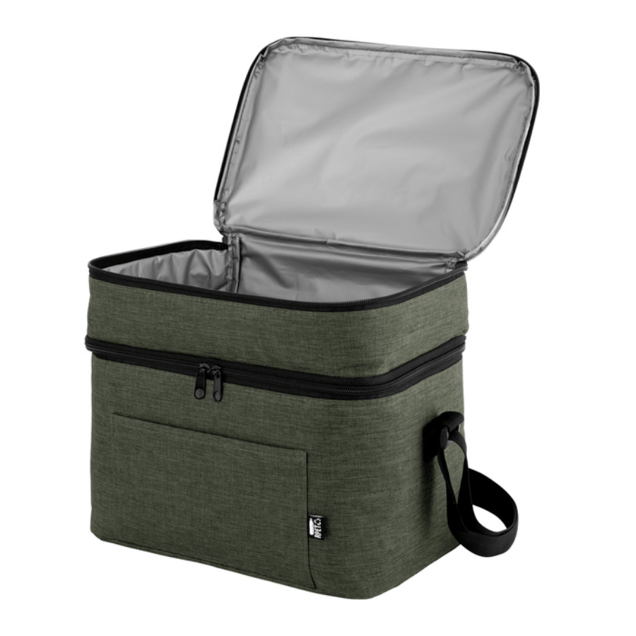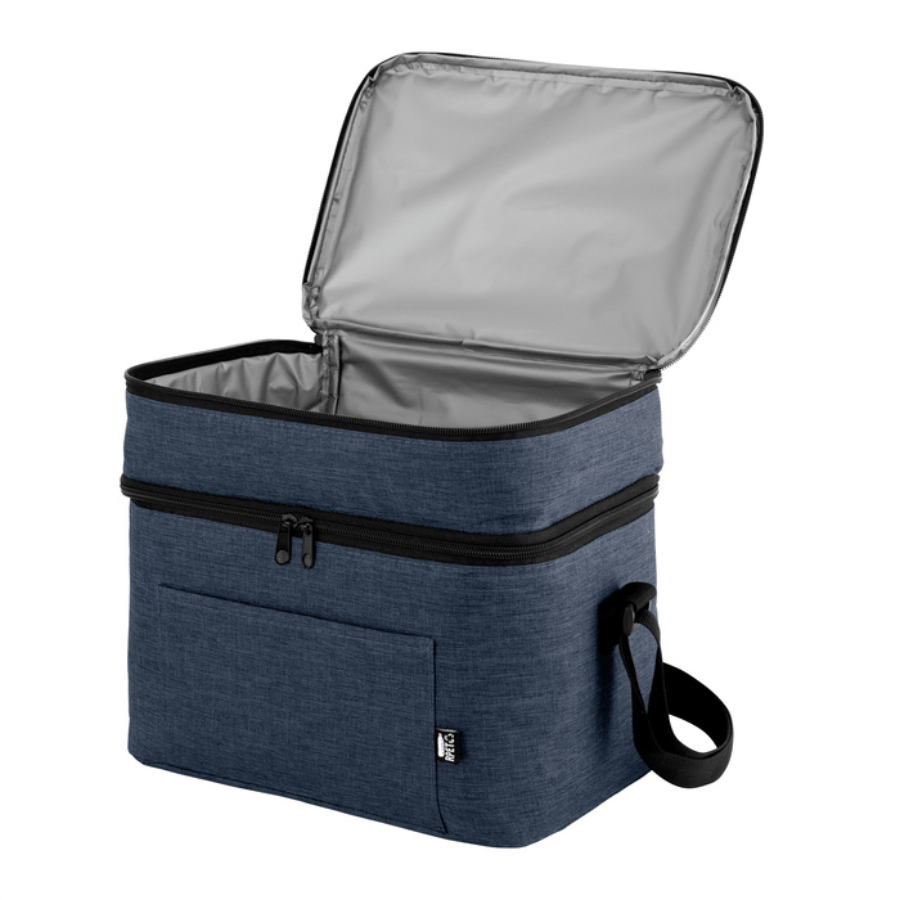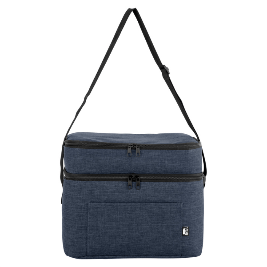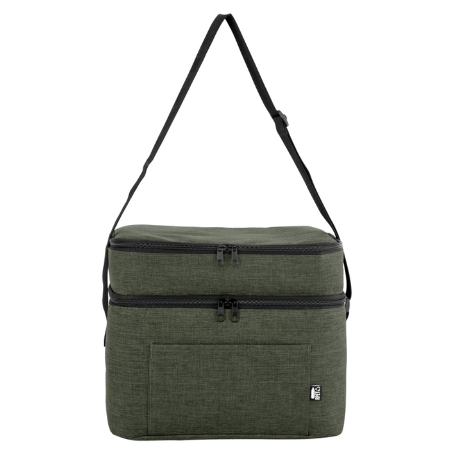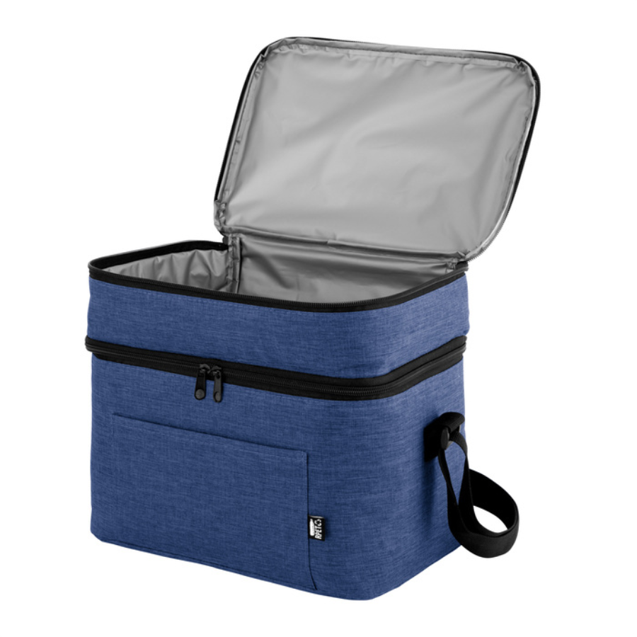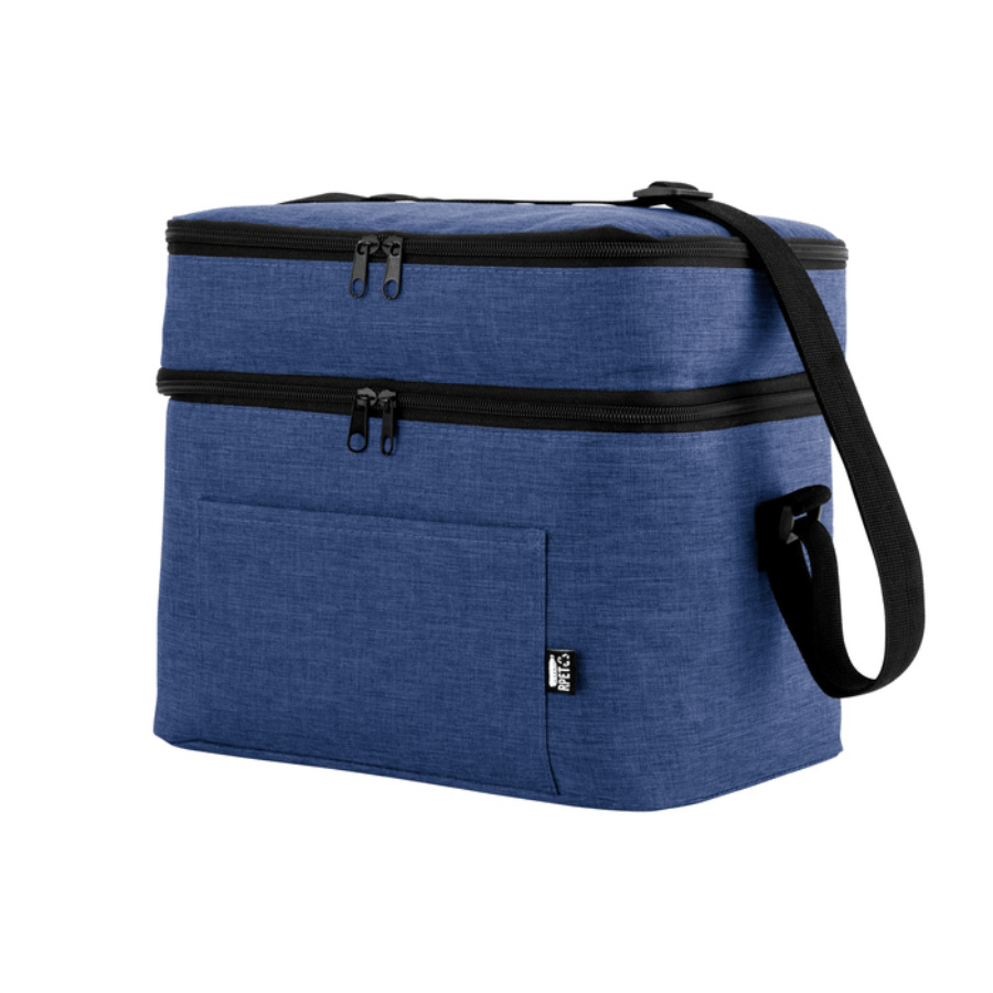 Bolso térmico de dos pisos . Cierres perimetrales bidireccionales. Correa regulable con hebillas plásticas. Bolsillo frontal. Amplio compartimento principal y compartimento superior ideal para separar recipientes con alimentos.