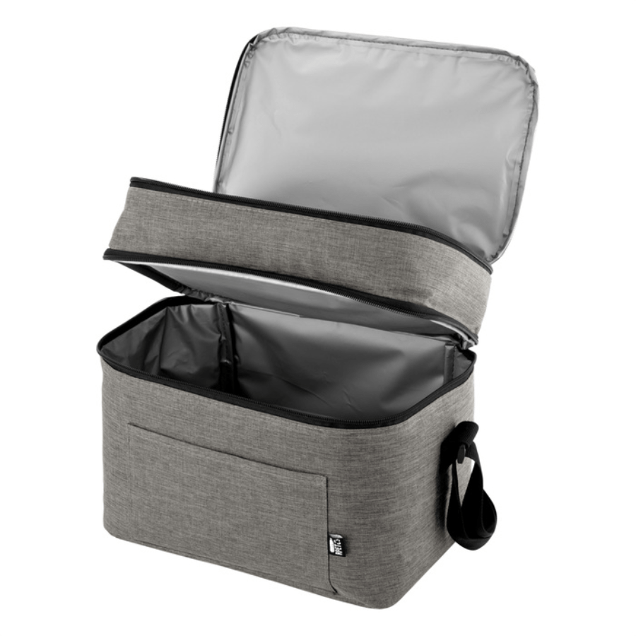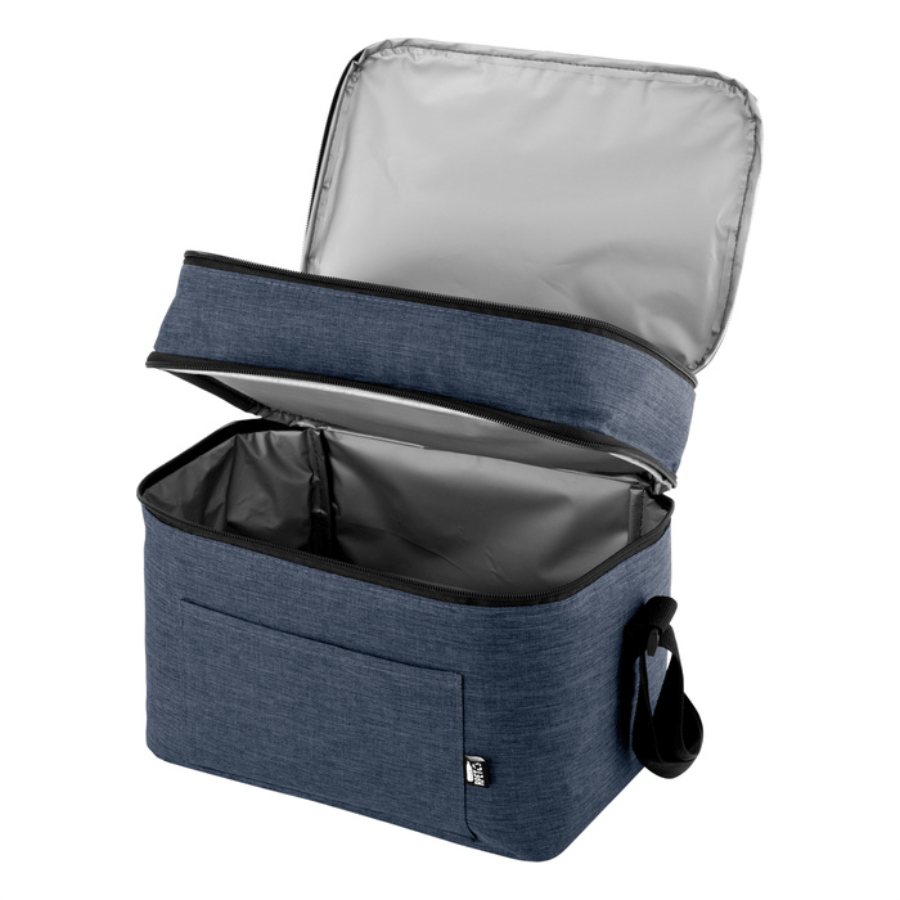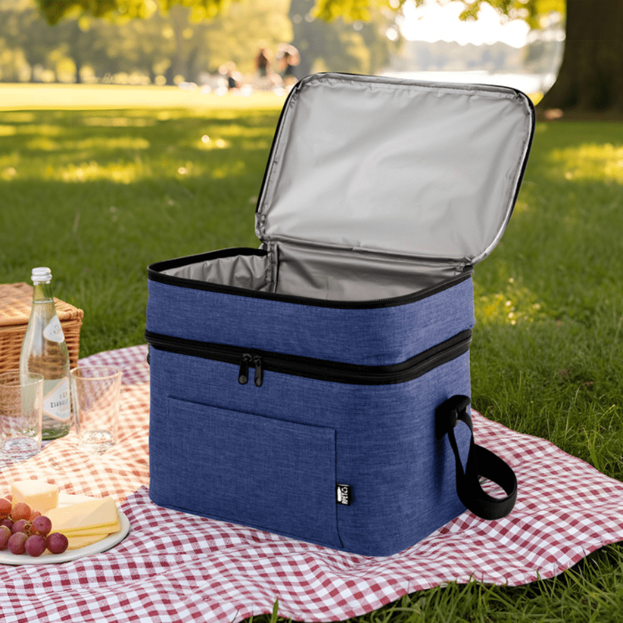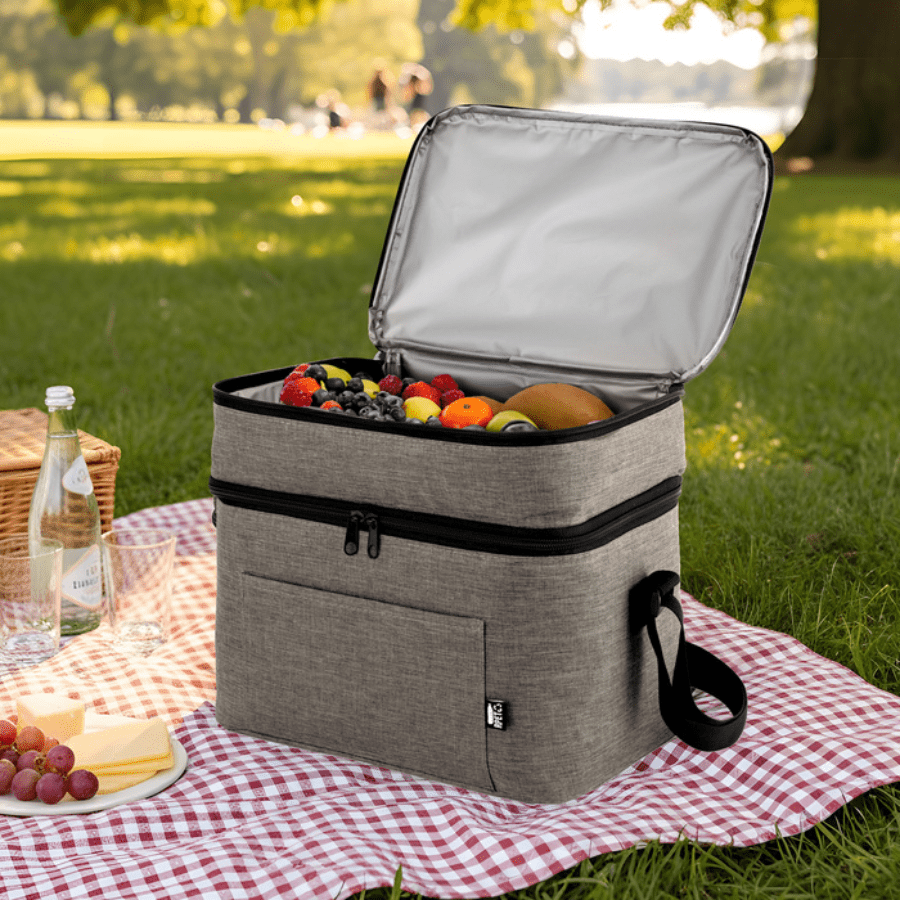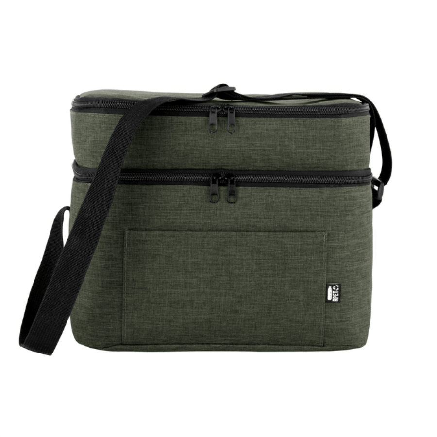 Bolso térmico de dos pisos . Cierres perimetrales bidireccionales. Correa regulable con hebillas plásticas. Bolsillo frontal. Amplio compartimento principal y compartimento superior ideal para separar recipientes con alimentos.