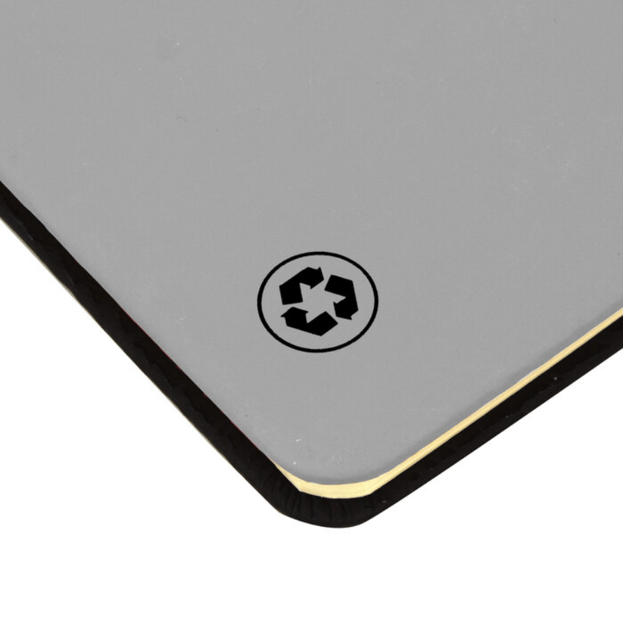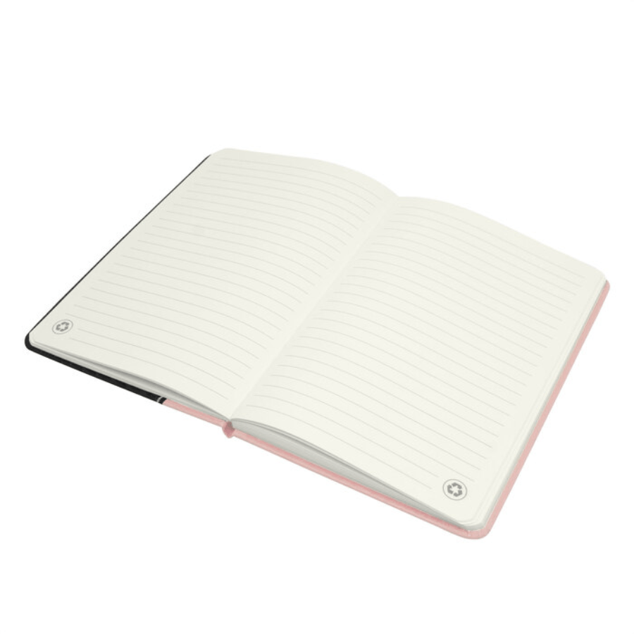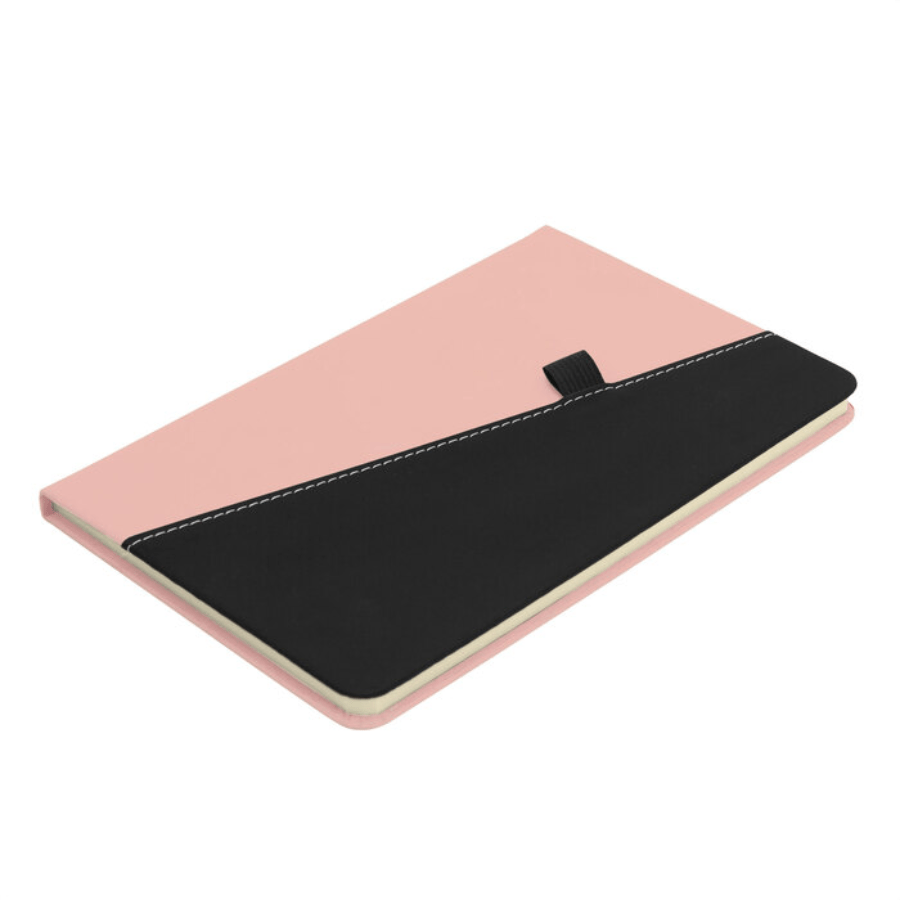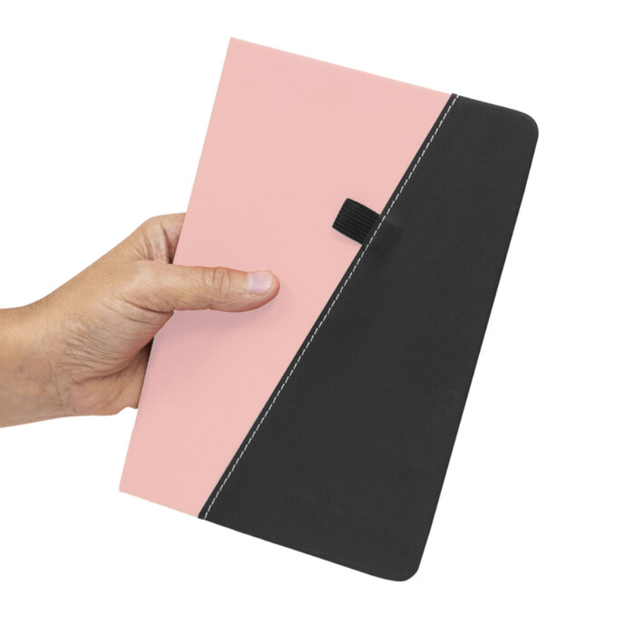 Libreta. Tapa de cartón rígido recubierta en poliuretano bicolor (diferentes colores combinados con negro). Interior de 80 hojas rayadas en papel obra de 70g. Encuadernación cosida. Inlcuye portalápices elástico color negro.
